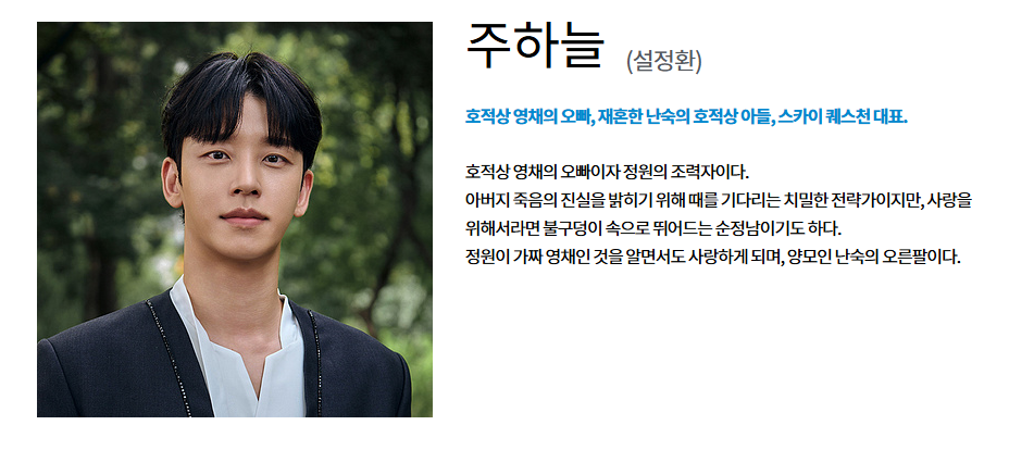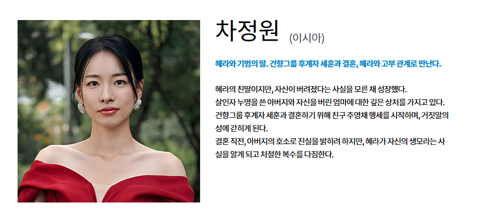 전개 방식 또한 빠른 편입니다. 첫 회부터 주인공 차정원이 주영채 행세를 하는 장면이 곧바로 등장하며 시청자에게 강한 인상을 남깁니다. 초반부터 핵심 갈등을 숨기지 않고 드러내는 전개는 이야기에 빠르게 몰입하게 만드는 요소로 작용합니다. 차정원이라는 인물 역시 단순히 부잣집 악녀에게 당하는 가난한 피해자에 머무르지 않습니다.