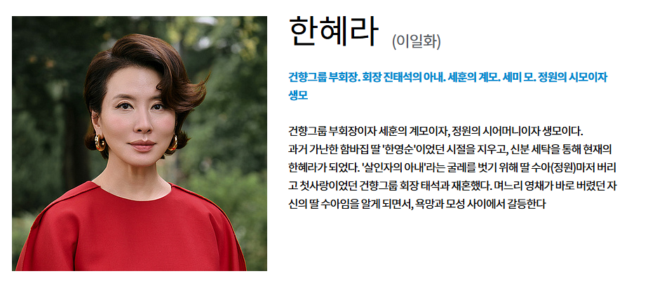 극의 중심축을 이루는 한혜라와 공난숙의 관계 역시 많은 주목을 받고 있습니다. 한혜라는 과거에 버렸던 딸 차정원으로 인해 가문의 입지가 흔들리는 위기에 처하면서도 여전히 딸에 대한 애정을 놓지 못하는 인물입니다. 반면 공난숙은 주영채와 차정원에게 폭력과 학대를 서슴지 않는 잔혹한 면모를 보이면서도 의붓아들 주하늘에게는 주상철을 죽인 사실이 드러난 이후에도 끝까지 아군이자 아들로 품어주는 복합적인 모습을 보여줍니다.