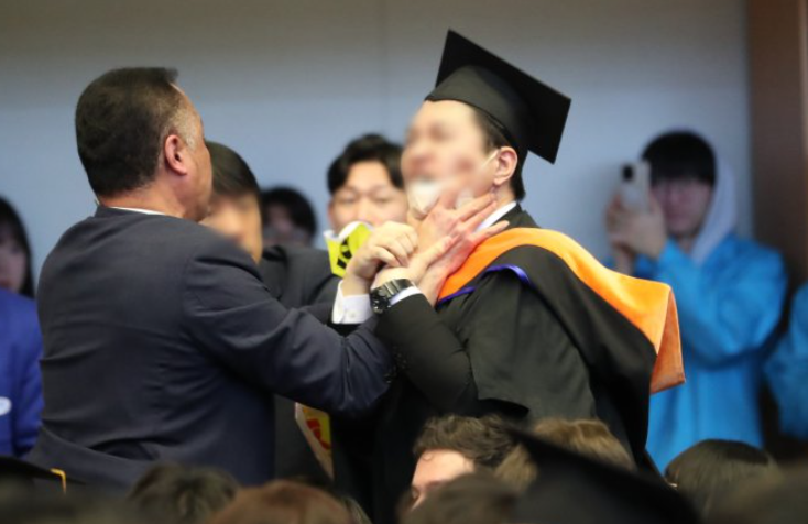 지난 카이스트 졸업식에서는 대통령 연설중 소란과 항의가 발생하였으며 경호원들이 이를 제지하고 끌어내는 장면이 목격되었습니다.