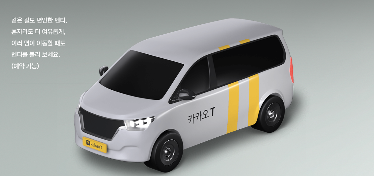 벤티의 경우 대형 택시 서비스입니다. 예를 들어 현대 스타렉스나 기아 카니발과 같은 대형 차량들을 이용하실수 있습니다. 여러명이서 이용한다면 고려해보실수 있습니다.