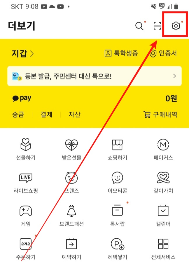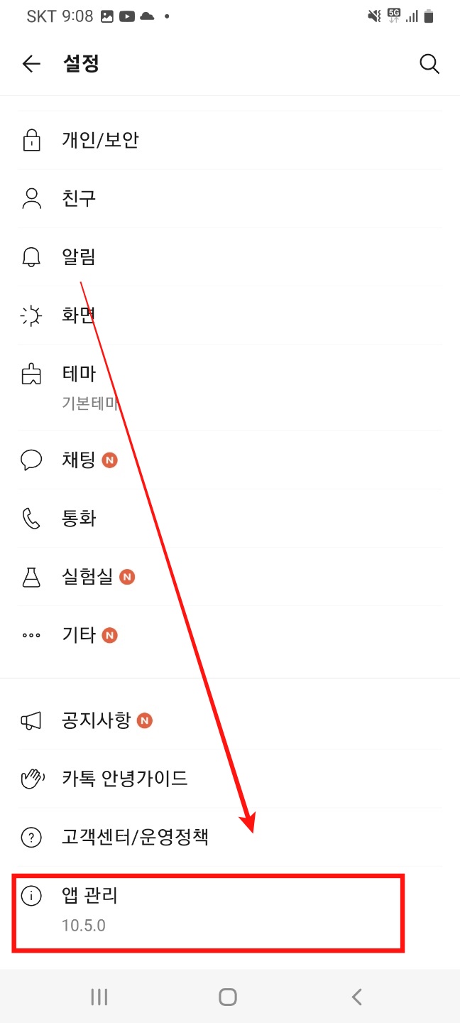 만약 현재 사용중인 카톡의 버전을 잘 모르시겠다면 우측 상단에 톱니바퀴 모양을 클릭합니다. 이후 하단을 보시면 앱 관리에서 나온 숫자를 통하여 현재 카카오톡 버전이 무엇인지 확인하실수 있습니다.