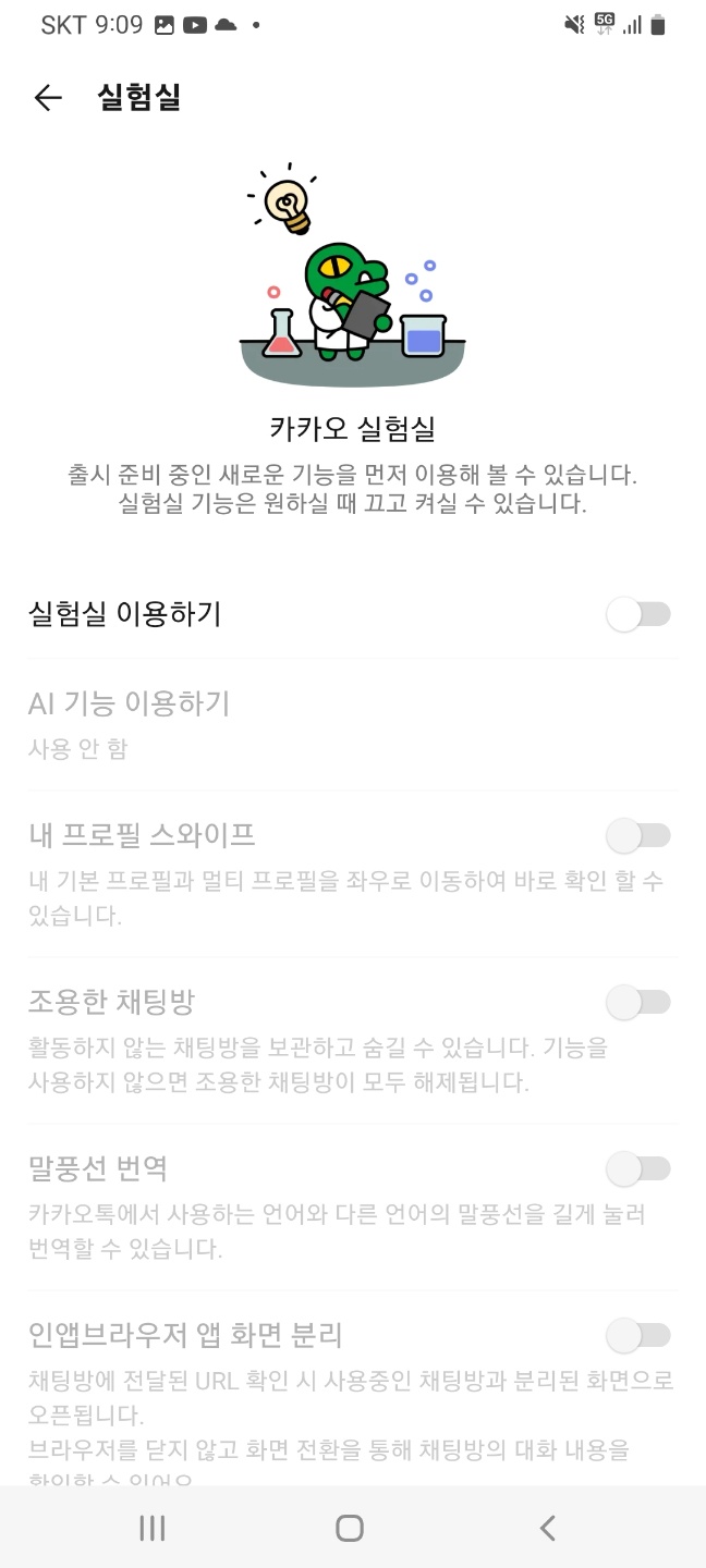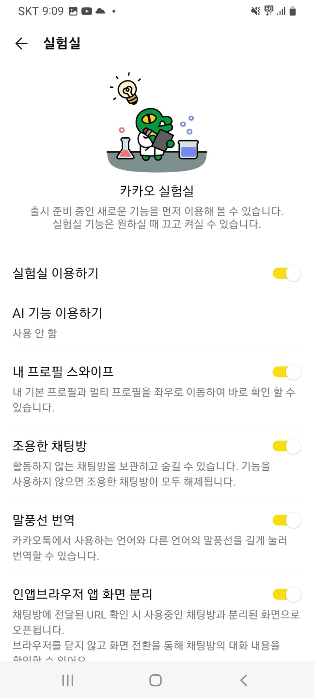 여기서 최상단에 실험실 이용하기를 우측으로 드래그 하면 노란색 버튼이 뜨면서 활성화가 됩니다. 그러면 조용히 나가기 기능도 자동으로 활성화가 이루어지게 됩니다.