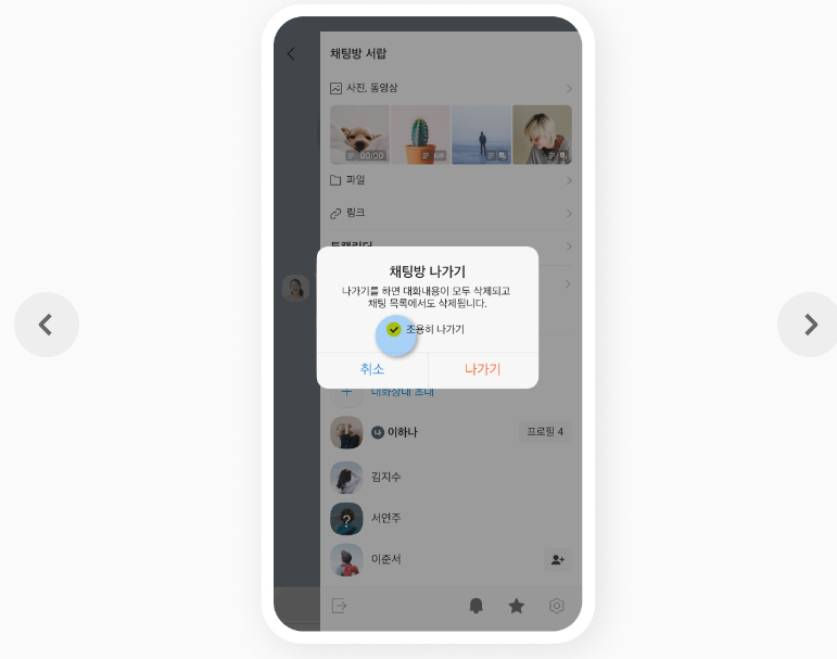단 조용히 나가기 기능은 일반채팅방에서만 사용이 가능합니다. 채팅탭 목록에서는 조용히 나가기가 지원되지 않으며 대화 내용이 모두 삭제되고 채팅 목록에서도 삭제되므로 이점을 유의하셔서 사용하시기 바랍니다.