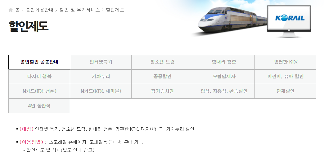 먼저 할인등 필수로 알고 있으셔야 할 점들에 대해 안내해 드리겠습니다. 열차출발1개월전부터 오전7시까지 열차출발전까지 승차권 구매가가능합니다. 홈페이지나 앱등은 출발 20분전까지 가능합니다.