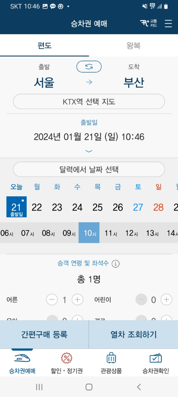 설치가 끝나셨다면 이후 출발역과 도착열을 선택하시고 시간과 날짜등을 지정합니다.