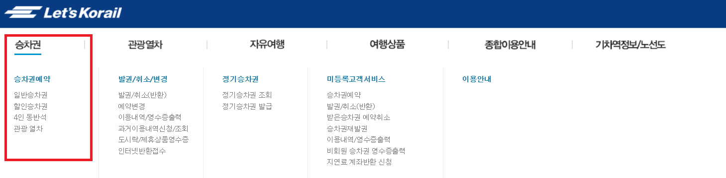 다음으로 코레일 홈페이지에서 예약하는 방법에 대해 안내해 드리도록 하겠습니다. 먼저 코레일 공식 사이트에 접속하셔서 회원가입을 진행합니다. 상단바 메뉴에서 승차권 예약 코너로 이동합니다.