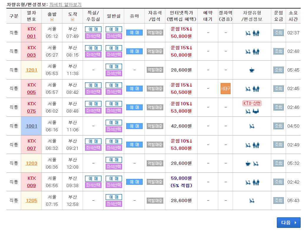 승차인원이 더 있다면 플러스 버튼을 눌러서 추가합니다. 유아 좌석의 경우 할인된 금액으로 진행되고 있습니다. 이후 열차의 시간과 출발, 도착 시간등이 표시되며 원하시는 시간대를 선정합니다.