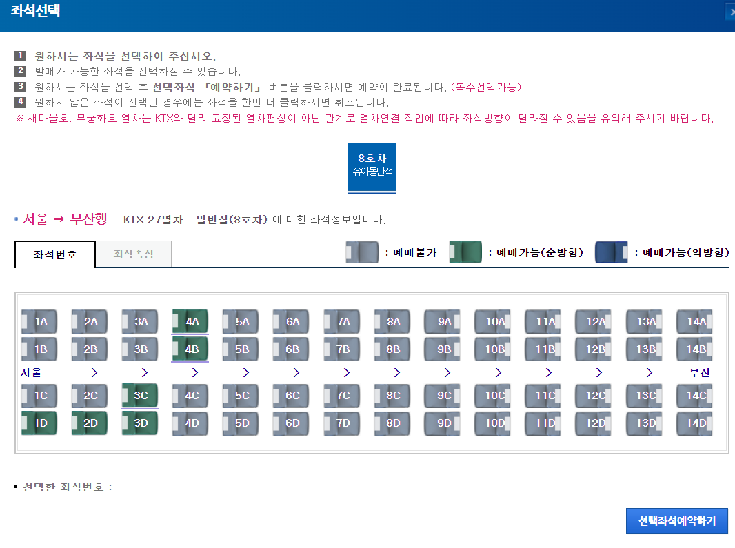 이후 좌석을 선택하시고 결제를 진행하시면 됩니다. 지금까지 코레일 기차표 예매방법에 대해 안내해 드렸습니다.