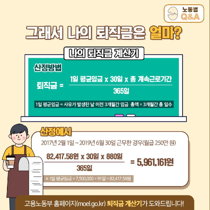 퇴직금 계산을 일일이 하나하나 계산하려면 어려우실수 있습니다. 퇴직금 계산은 고용노동부에서 제공하는 계산기등을 통하여 빠르고 쉽게 조회해 보실수 있습니다.