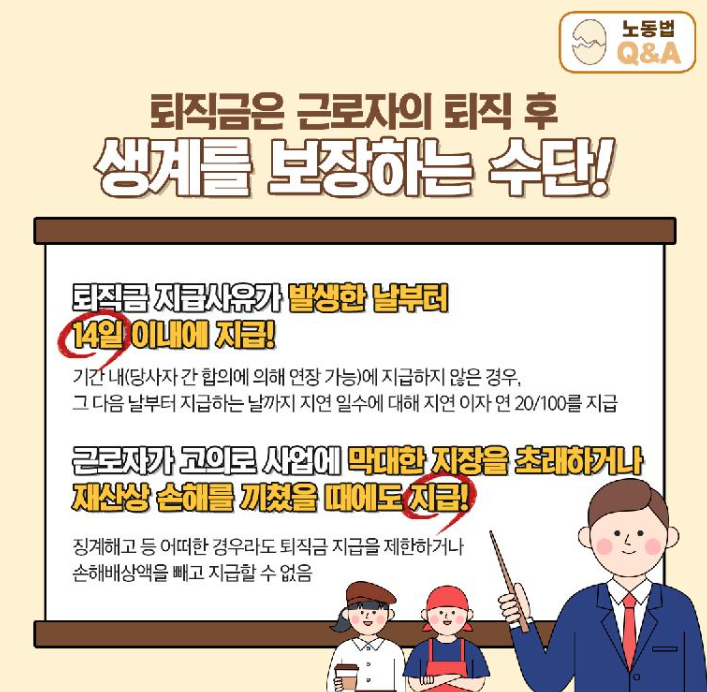 지급기한의 경우 2주 이내에 지급할 것을 규정하고 있습니다만 합의하에 기일을 조정할수는 있습니다. 또한 근로자가 큰 실수나 손해를 저질러도 회사는 조건에 충족하면 퇴직금을 지급해야 하는 규정이 있습니다.