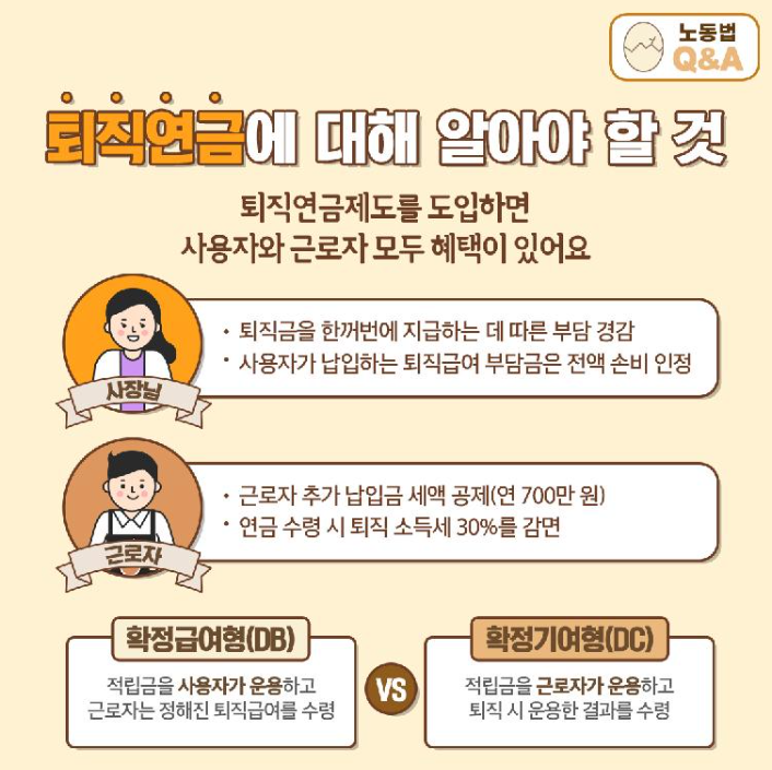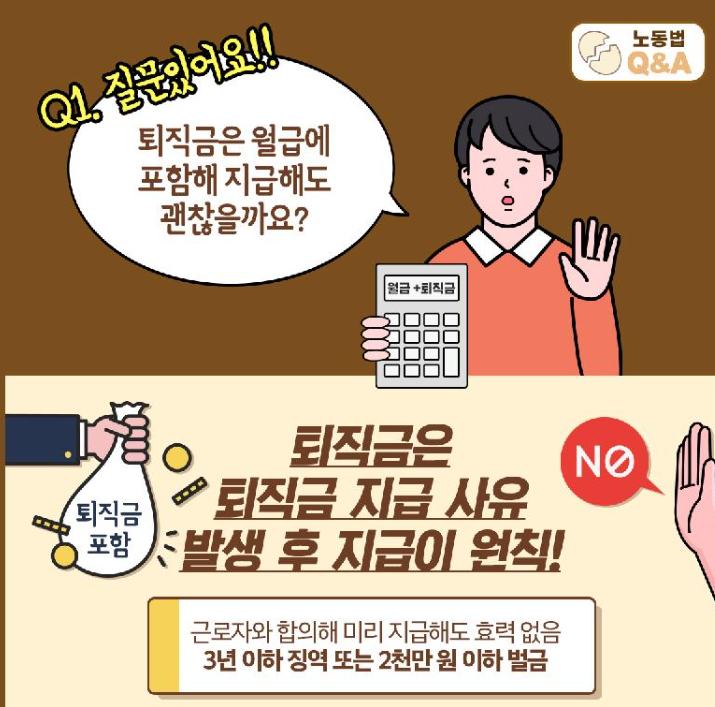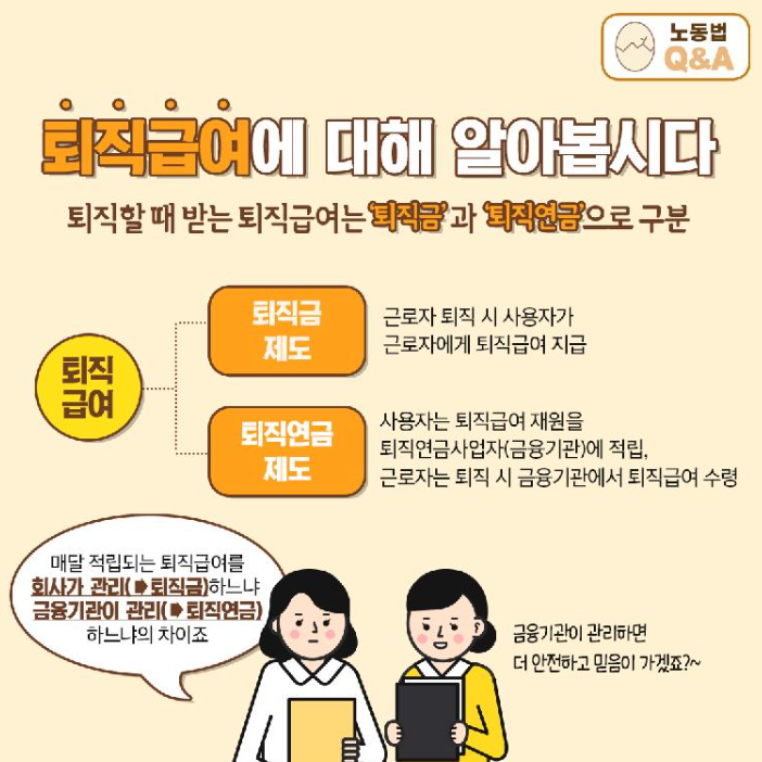 퇴직급여는 퇴직금 제도와 퇴직연금제도로 나뉘고 있습니다. 대한민국의 퇴직금 지급규정은 근로기준법을 기준으로 합니다.