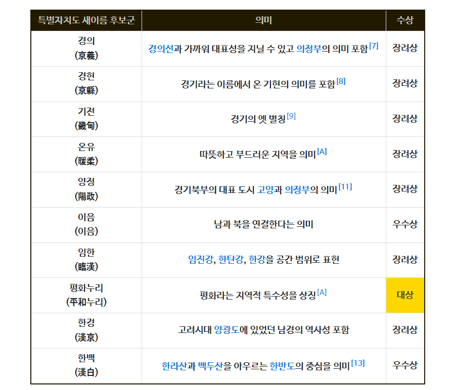 그러나 최근에 경기북부 특별자치도에 대한 이름 변경되는 것에 대한 여론은 상당히 분분합니다. 관례에 따라 도급 광역 자치단체의 이름을 정하는 방식과 달리 이번에는 조금 다른 방식으로 평화누리특별자치도라는 이름이 선택되었습니다.