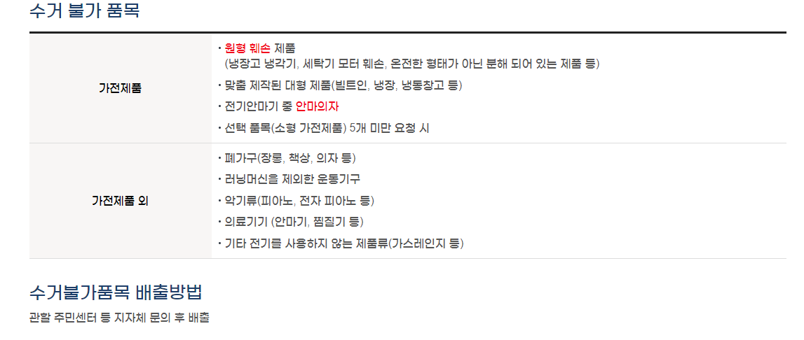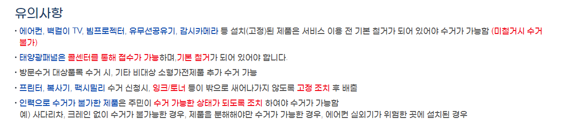 폐가전 수거 서비스는 말 그대로 수거만 하는 서비스입니다. 또한 원형이 훼손된 제품은 처리가 안되니 수거 불가 품목을 잘 확인해 보시기 바랍니다.