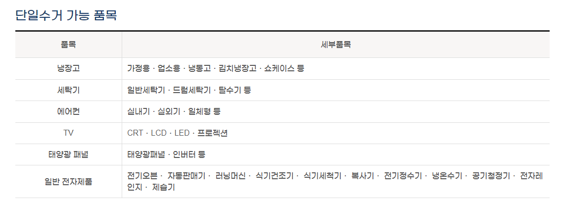 세트 품목은 함께 처리해야 하는 품목이며 단독처리가 가능한 부피가 큰 제품이 단일 수거 품목입니다. 단일 수거 품목으로는 냉장고, 세탁기, 에어컨, 티비등이 그 예입니다.