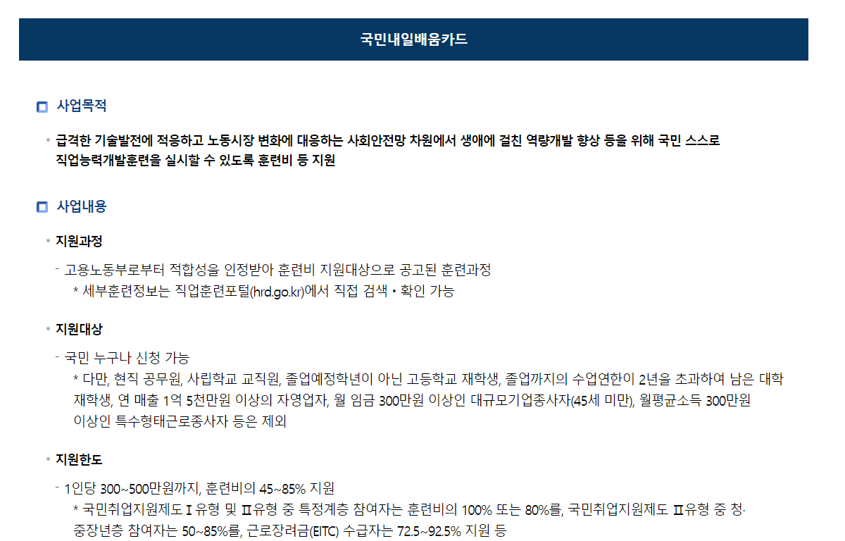 내일배움카드는 실업자, 재직자, 고등학교 졸업(예정)자, 만 30세 미만 청년 등 누구나 신청할 수 있는 정부 지원 교육 훈련 제도입니다. 한식조리사 자격증 국비지원을 받으려면, 먼저 내일배움카드를 발급받아야 합니다. 내일배움카드 발급은 고용노동부 홈페이지나 거주지 관할 고용센터에서 할 수 있습니다.