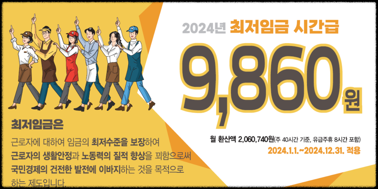 2024년 최저임금이 작년도인 2023년도 9620원보다 2.5% 올랐으며 시간당 9860원으로 확정되었습니다. 관심이 집중된 시급 1만원 돌파는 2020년 최저임금 1만원 목표기준으로 4번 연속 무산되었습니다.