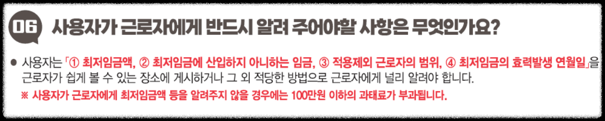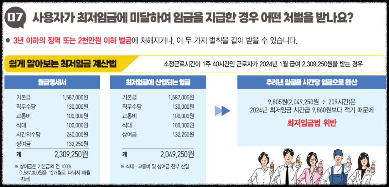 하지만 이보다 낮은 임금을 지급하면 법 위반입니다. 최저임금을 지키지 않으면 3년 이하의 징역 또는 2천만 원 이하의 벌금에 처해질 수 있습니다.