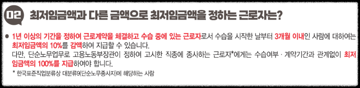 최저임금은 모든 사업장에 동일하게 적용되며 수습 기간 3개월 동안에는 최저임금의 90%까지 지급할 수 있습니다.