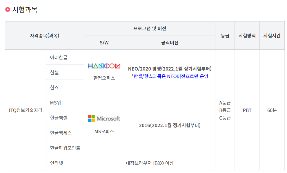 크게 한컴오피스와 MS오피스로 구별됩니다. 아래한글, 한셀, 한쇼등의 과목을 시험보는 것이 한컴오피스입니다. MS 워드, 한글엑셀, 한글엑세스, 한글 파워포인트 과목을 시험보는 것이 MS오피스입니다. 동일 회 차에 아래한글/MS워드, 한글엑셀/한셀, 한글액세스, 한글파워포인트/한쇼, 인터넷의 5개 과목 중 최대 3과목까지 응시가 가능하지만 한글엑셀/한셀, 한글파워포인트/한쇼, 아래한글/MS워드는 동일 과목군으로 동일 회차에 응시가 불가능하오니 참고하시기 바랍니다.