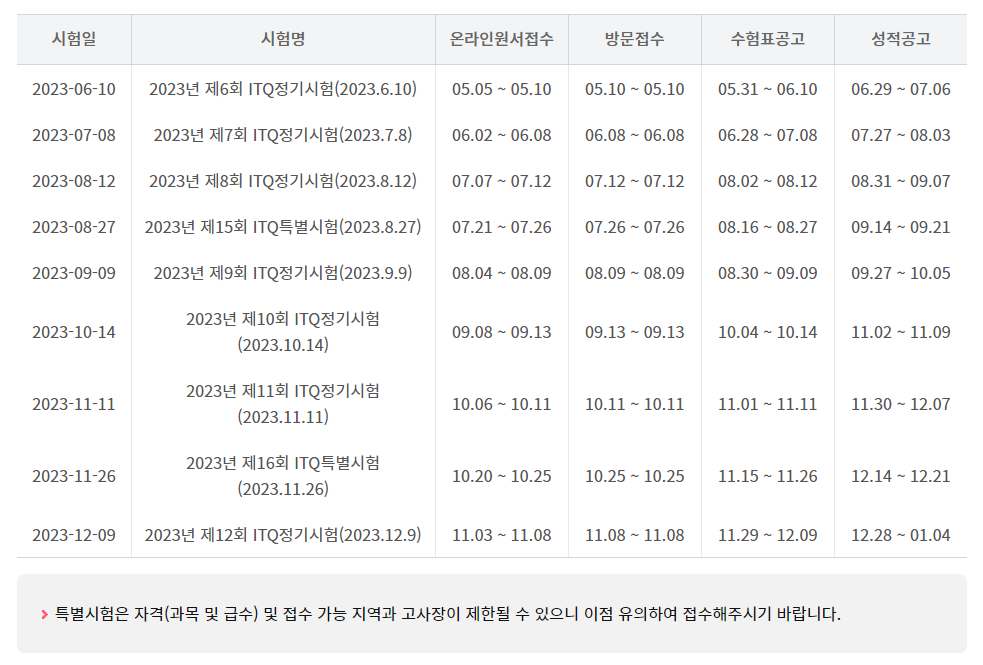 정기시험은 보통 매주 둘째주 토요일에 실시되며 2, 5, 8, 11월 넷째주 일요일에도 실시합니다. 참고로 마스터자격증이라는 것이 있습니다. ITQ시험 3가지에서 모두 A등급을 받으면 마스터 자격증을 받을 수 있습니다.