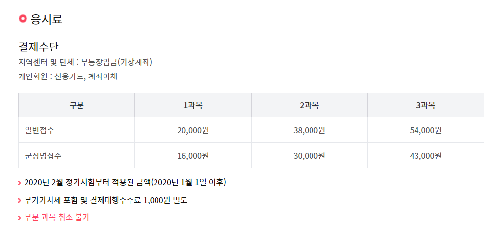 비용의 경우 일반접수시 1과목에 2만원 2과목 3만8천원 3과목 5만4천원이며 군인일 경우에 조금 더 저렴하게 응시가 가능합니다.
